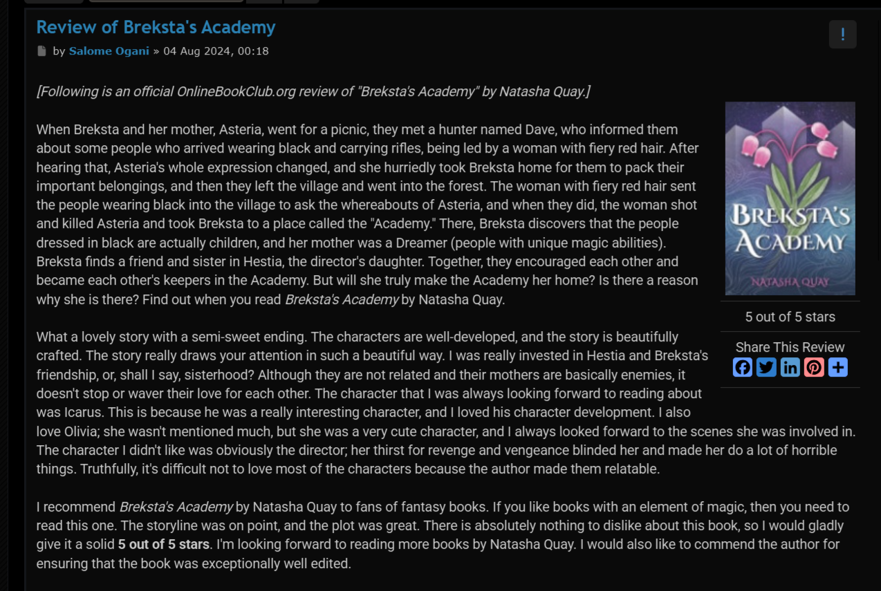 OnlineBookClub has published a glowing review of Breksta’s Academy, awarding it a perfect 5 star rating. Reviewer Salome Ogani praised the story’s rich worldbuilding, memorable characters, and emotional depth. Below is the full review exactly as it appeared on OnlineBookClub.